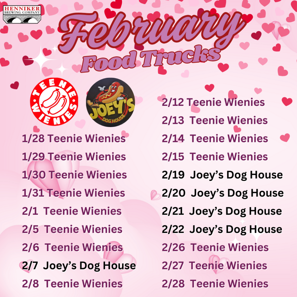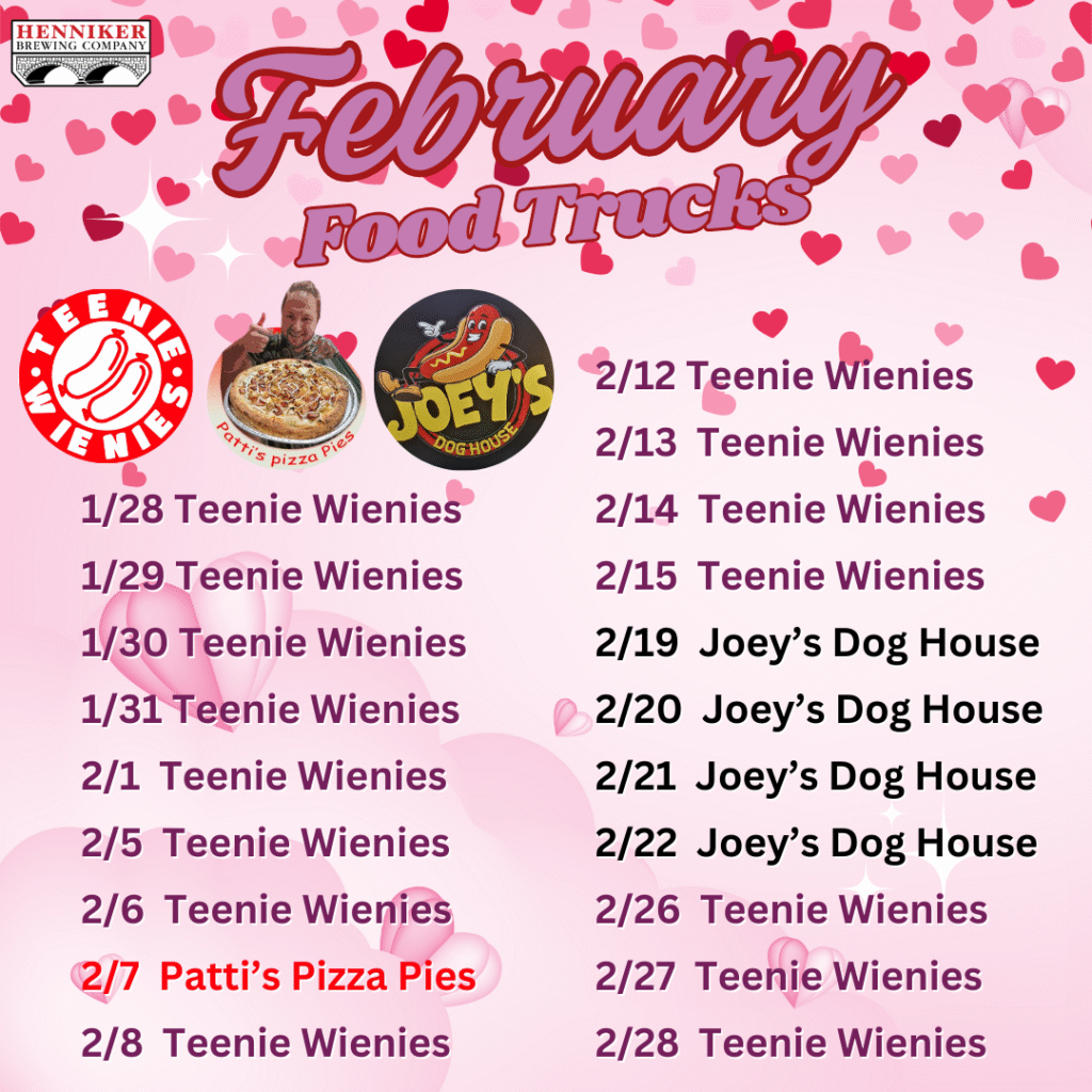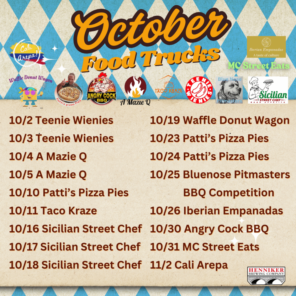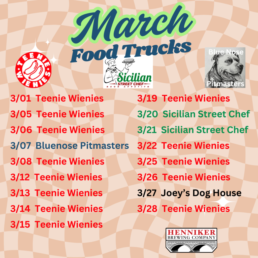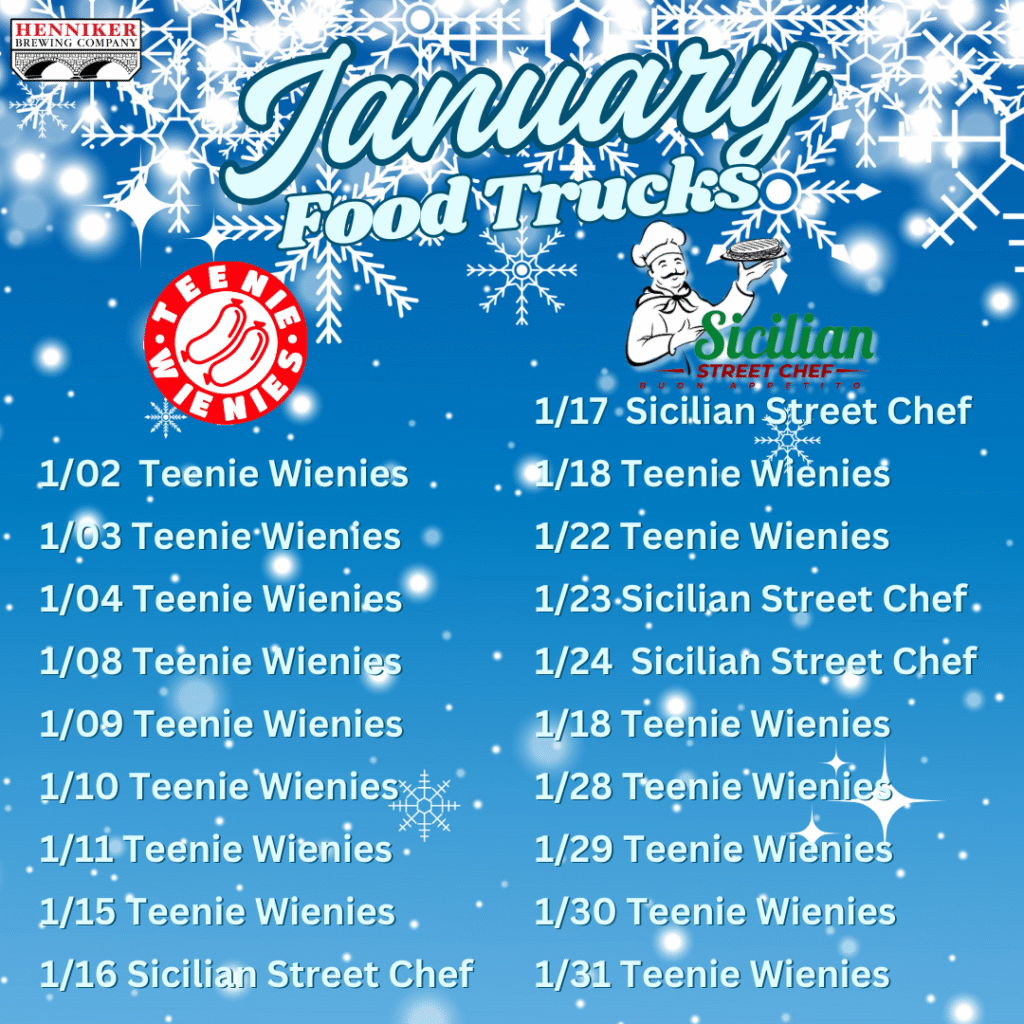 Here at Henniker Brewing, we make beer. Beer might have served as dinner back in the middle ages (and maybe once or twice for us in our younger days) but typically we need more. That’s why we collaborate weekly working with the best food trucks and pop-ups in the state to bring the best food we can here to Henniker. See below for this month’s lineup. Sometimes things change, check out our weekly posts on Facebook and Instagram for the most updated info!